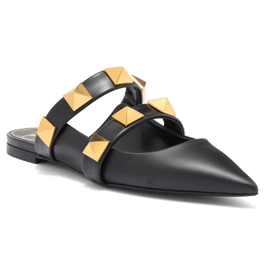 Valentino Garavani Black Roman Stud Flat Leather Mules Gold