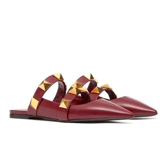 Valentino Garavani Burgundy Roman Stud Flat Leather Mules Gold 35.5