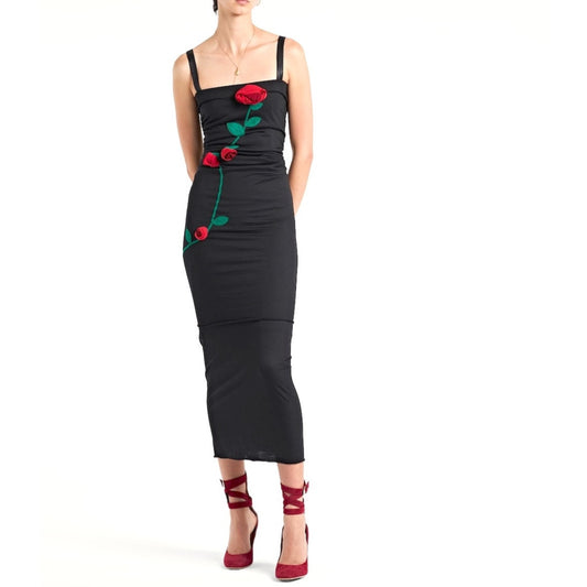 DOLCE & GABBANA Black Runway Rose Applique Fitted Long Dress Red S 40
