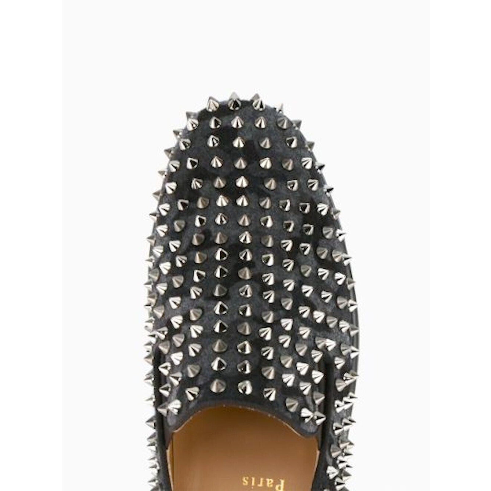 With these grey Christian Louboutin 'Roller-Boat Flat' spiked camouflage shoes, you will be anything but inconspicuous (you know you love it). Manufactured in Italy from wool, these slip-on sneakers feature a round toe, silver-tone spikes, elasticated side panels, a grey camouflage print, leather insole and a flat rubber sole. Team your Christian Louboutin shoes with a white shirt and Rag & Bone jeans to the next soiree.