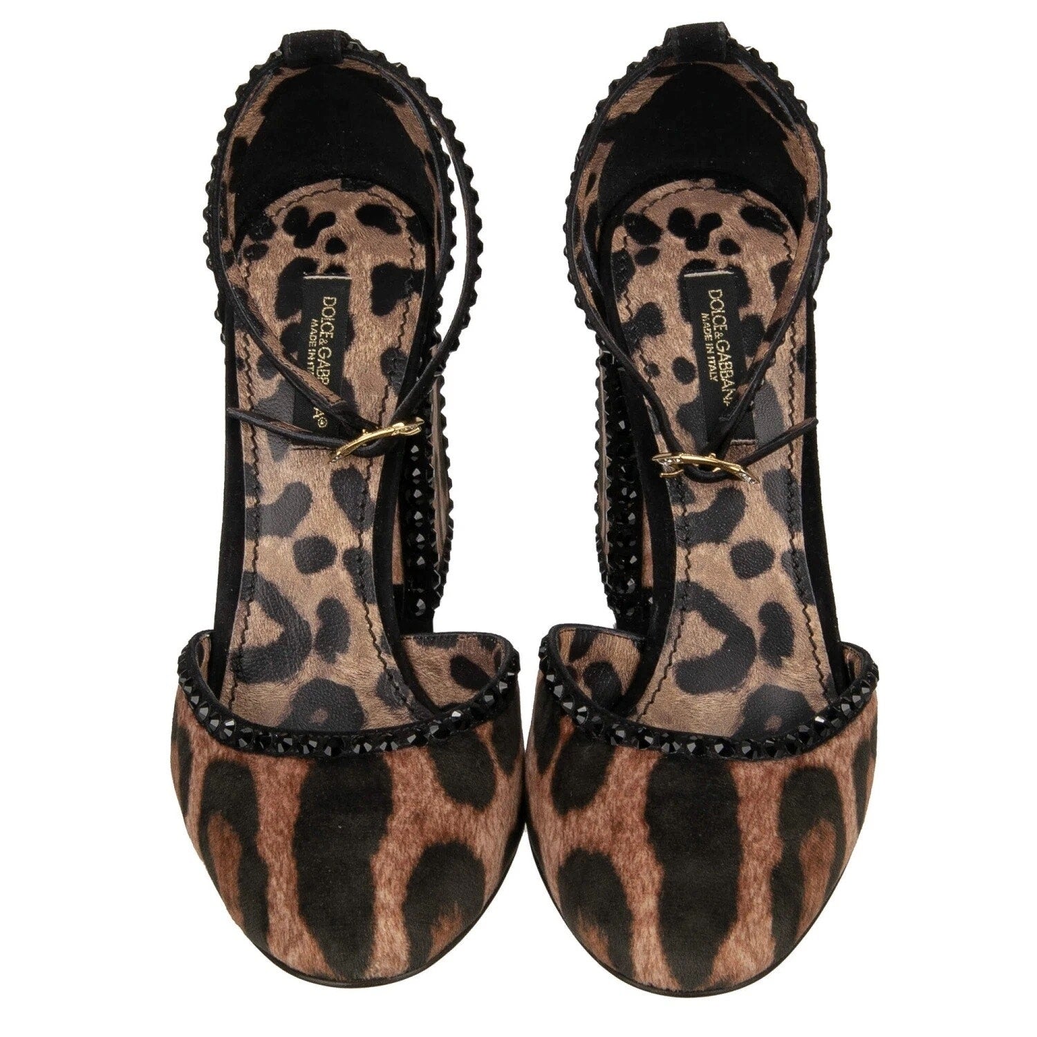 Dolce & Gabbana Leopard Crystal Velvet Ankle Strap Pumps Black Brown
