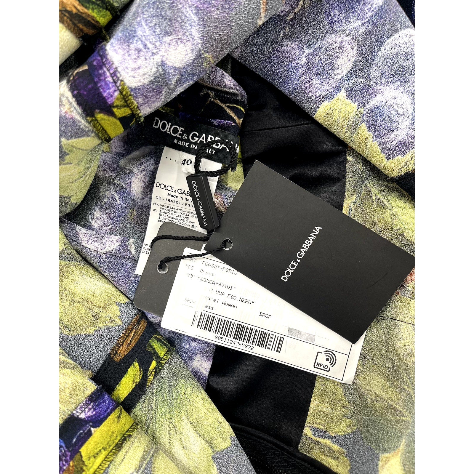 This DOLCE & GABBANA midi dress features a floral design, round neck, and long sleeves. It has no pockets, a rear closure with a hook-and-bar and zip, and is unlined with stretch crepe material. The dress also includes logo and folds.