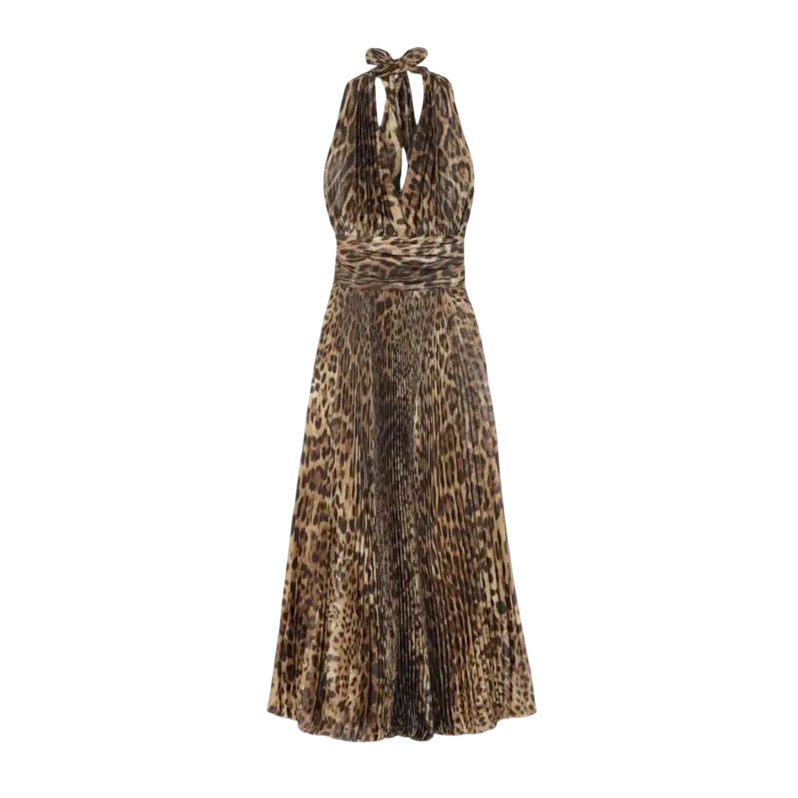 Dense pleating amplifies both the darkness and the light within the leopard print on this halter-neck midi with built-in sashay.