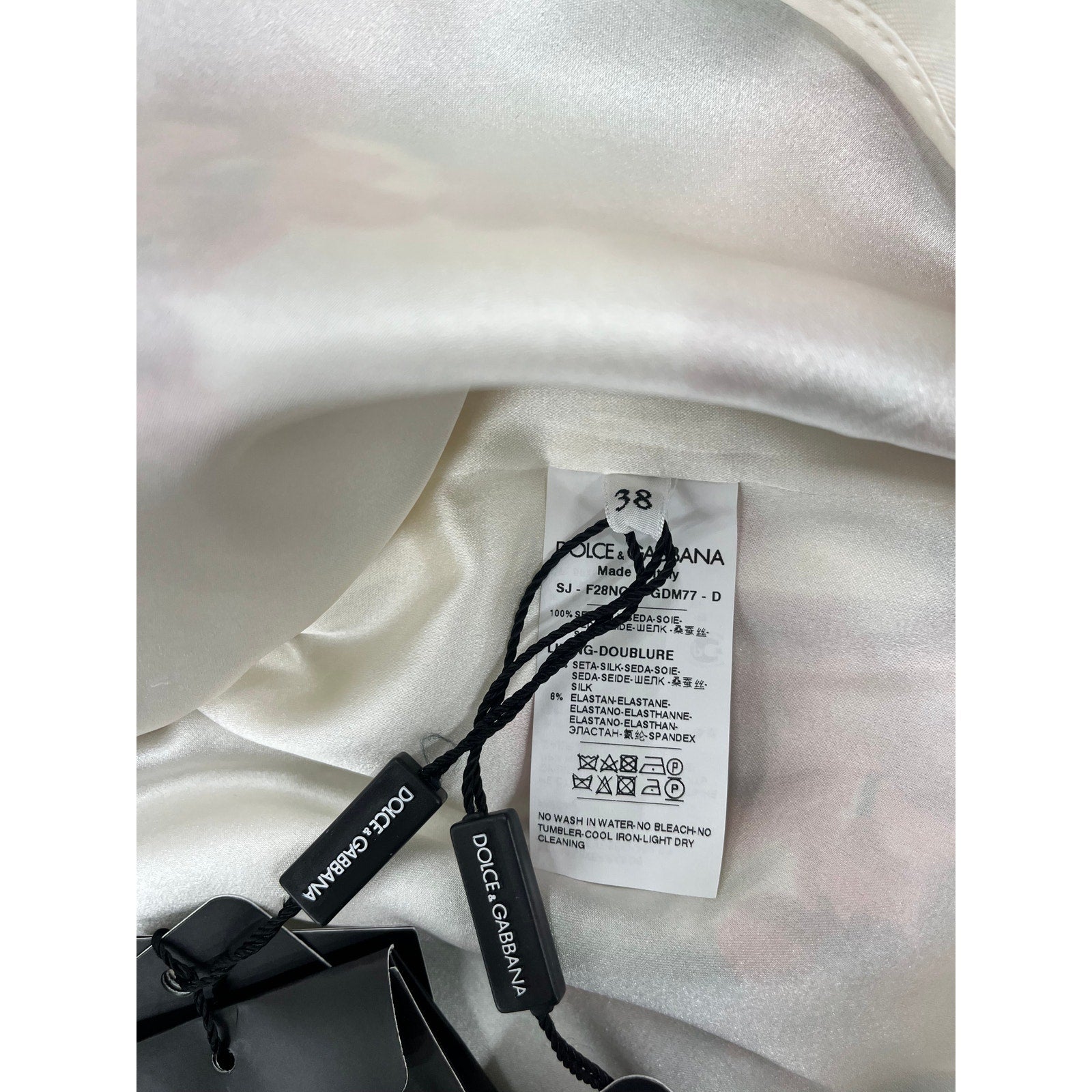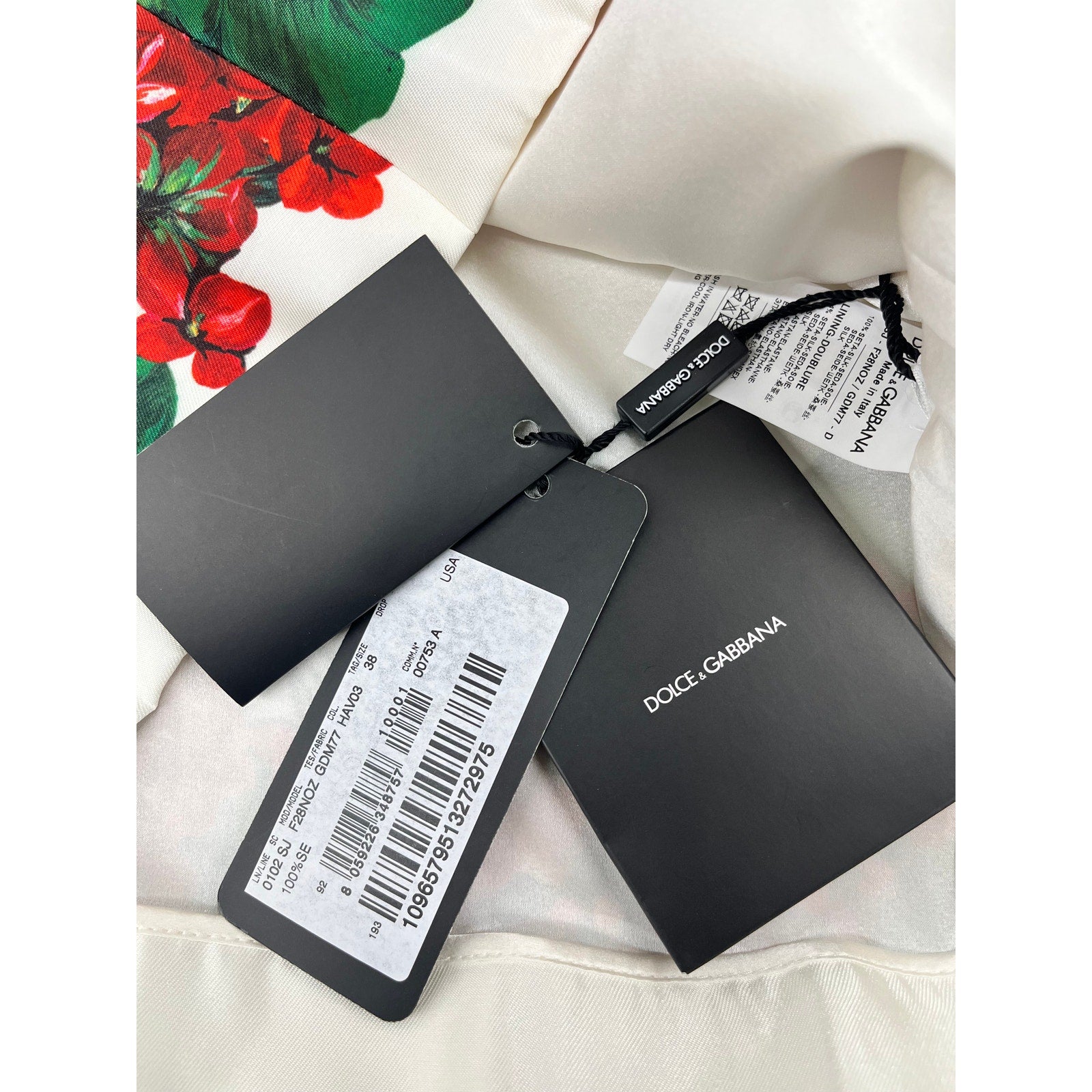 This Dolce & Gabbana jacket is a collarless, single-breasted piece featuring a vibrant red and green floral print on a white background.