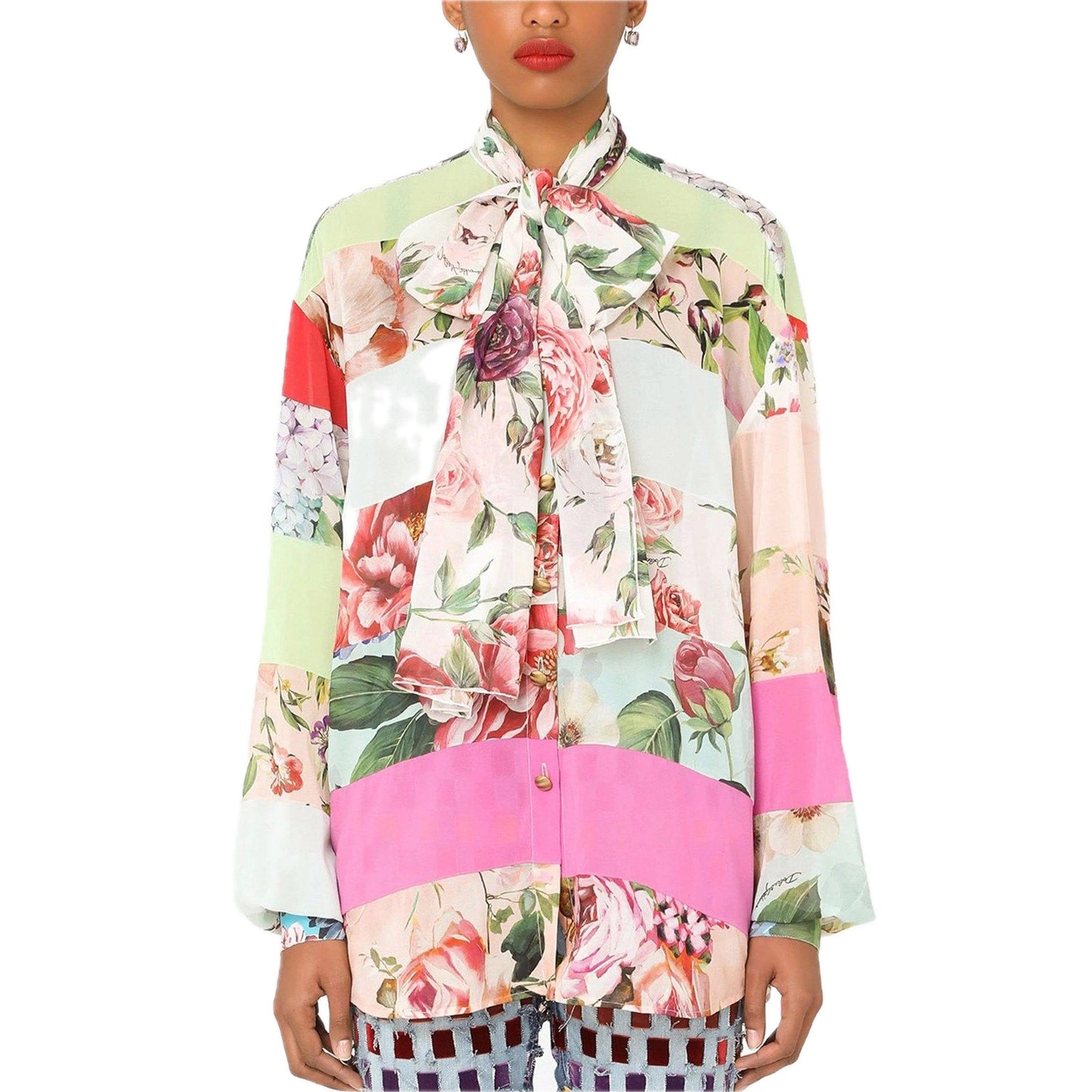 Indulge in the beauty of flowers with our Ascot collar Bow Floral Shirt from Dolce & Gabbana. Expertly printed with vibrant florals, this shirt is the perfect addition to any wardrobe. Made for women who deserve the best, our shirt is a must-have for any fashion-forward individual.